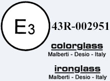 Omologazione rilasciata dal Ministero dei Trasporti secondo il Regolamento Europeo n° 43 riguardante i vetri di sicurezza temperati installati su veicoli a motore. Nostro marchio di fabbrica Ironglass e Colorglass